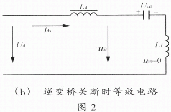 在負載短路時,逆變橋囚侵入干擾信號而產(chǎn)生直通短路,逆變橋輸入電壓突降為零。這時,原來儲藏在濾波電感Ld中的磁能和隔直電容Cd中的電能均分別以短路電流ids和iHs的形式向逆變電路釋放,等效電路圖為圖2(a)所示。橋中IGBT流過的短路電流is為