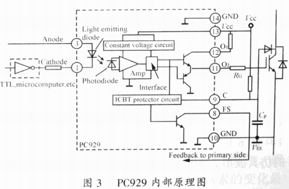 所謂降柵壓慢關斷技術指的是,當IGBT出現(xiàn)過流時,先將其柵極驅(qū)動電壓降低,然后將其關斷,一是延長了IGBT能夠承受過流的時間,二是可以降低器件受到過流沖擊的幅度。過流時器件通態(tài)壓降升高,管子瞬時熱損耗急劇增加,為防止器件熱損壞,過流時間應足夠短,一般<10μs。SHARP公司的光耦合器PC929將這一功能和驅(qū)動電路集成在一起,器件內(nèi)部原理圖如圖3所示。
