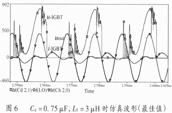 圖6是LT/Cd=4,Cd=0.75μF,LT=3μH時的仿真波形,通過與圖4和圖5的對比可以看出,此時參數(shù)選擇最為合適。