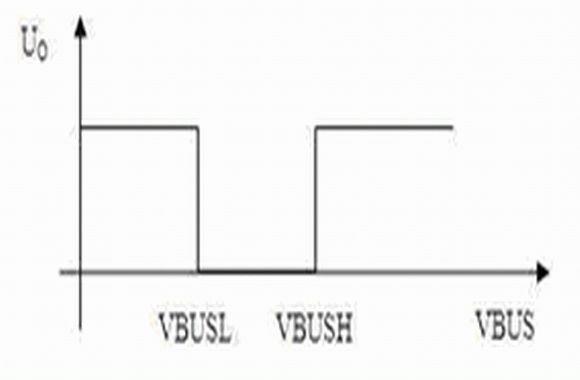 當(dāng)U- > U+ 時,比較器輸出電平發(fā)生反轉(zhuǎn),由式(1)、(4)、(7)、(8),設(shè)此時VBUS的值為VBUSL,有: