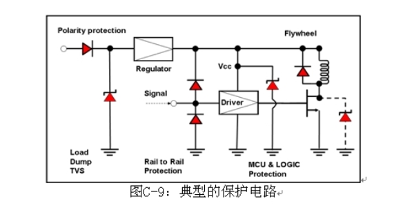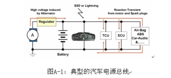 汽車電子,如電子控制單元、傳感器和娛樂(lè)系統(tǒng),都是連接在一根電力線上。這些電子產(chǎn)品的功率來(lái)源是電池和發(fā)電機(jī),兩者的輸出電壓都不穩(wěn)定,會(huì)受到溫度、操作狀態(tài)和其他條件的影響。此外,由于這些系統(tǒng)使用了螺線管負(fù)載,如燃料噴射、氣門、發(fā)動(dòng)機(jī)、電氣和水解控制器,ESD、尖峰噪聲和各種瞬變及浪涌電壓都會(huì)進(jìn)入電源及汽車系統(tǒng)的信號(hào)線。