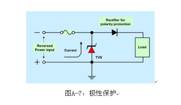 大電流應(yīng)用極性保護(hù)的一種解決方案是使用高正向電流能力的整流器,或者是在電力線中使用沒(méi)有極性保護(hù)二極管的負(fù)載突降TVS,如圖C-10所示。