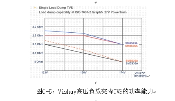 圖C-4考慮到了汽車電子中半導(dǎo)體的最大輸入電壓的約定是75 V的需求,某些Vishay負(fù)載突降系列可以滿足42 V電源系統(tǒng)的要求。
