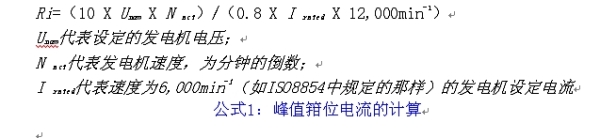 對(duì)于14 V系統(tǒng)的大型發(fā)電機(jī)來(lái)說(shuō),由以下ISO7637-2和ISO-8854的公式1)得出的220 A的發(fā)電機(jī)內(nèi)阻為0.33 Ω,300 A型的內(nèi)阻為0.24 Ω。