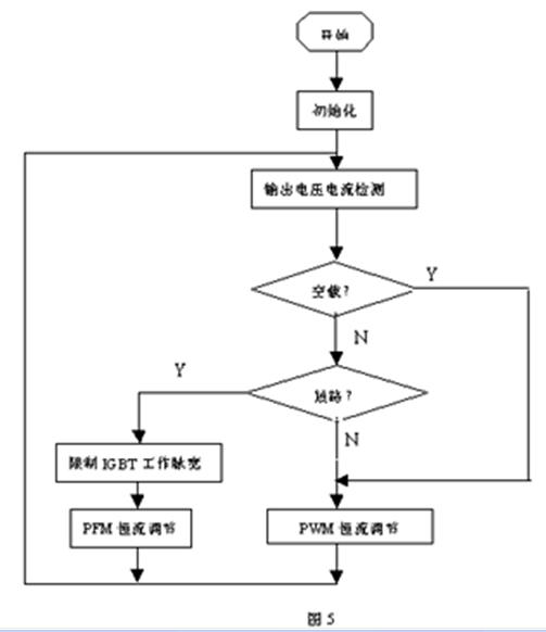 同時(shí)為保證輸出電流恒定,單片機(jī)在判斷輸出為短路時(shí)將逆變器的等脈沖寬度調(diào)節(jié)(PWM)變?yōu)轭l率調(diào)節(jié)控制(PFM),即脈沖分頻控制,輸出電壓越低,輸出脈沖的頻率越低。其單片機(jī)程序過(guò)程如圖5所示: