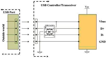 這個(gè)辦法的實(shí)質(zhì)是在USB接口附近連接一個(gè)保護(hù)元器件。它由幾支采用軌對(duì)軌結(jié)構(gòu)的二極管組成,本身具有低電容的特性。內(nèi)部鉗位器件為兩條數(shù)據(jù)線提供±25kVESD(ISO10605)保護(hù)功能,以及為Vbus電源線提供保護(hù)功能。