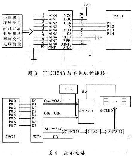 直流電壓、交流電壓以及機房溫濕度的測量選用TLC1543,TLC1543為10位11通道的A/D轉(zhuǎn)換器,與單片機的連接如圖3所示。機房環(huán)境測量(溫度、濕度)采用JWS溫濕度變送器,輸出信號為標(biāo)準(zhǔn)0~5V直流電壓信號;直流電壓的數(shù)據(jù)采集經(jīng)電阻分壓后直接送至A/D轉(zhuǎn)換器,交流電壓的采集經(jīng)分壓整流后也直接送至A/D轉(zhuǎn)換器。