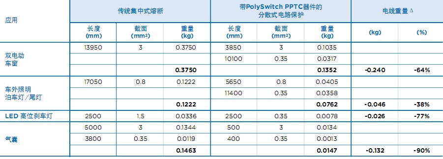 表. 傳統(tǒng)熔斷與分散式線束保護架構(gòu)的電線重量比較。電線重量計算以銅密度8.96x10-6kg/mm3為依據(jù)