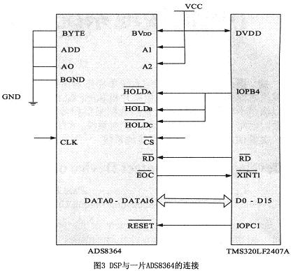 TMS320LF4207A本身雖然自帶A/D轉(zhuǎn)換器,但其轉(zhuǎn)換精度只有10位,且轉(zhuǎn)換速度也不高(500ns)。為了實現(xiàn)更高的速度和精度,選擇了擴(kuò)展ADS8364芯片。ADS8364是一種高速、低功耗、雙16bA/D轉(zhuǎn)換器,有6個模擬量輸入通道。可用BVDD獨立供電。它有6個完全相同的采樣保持電路,分成A、B、C3組,每一組都由1個HOLD引腳控制。ADS8364可以從外部引入最大5MHz的時鐘頻率,此時采樣時間是0.8μs,轉(zhuǎn)換時間只有3.2μs,A/D的最大采樣率達(dá)到250K,要達(dá)到此值,可在下一次轉(zhuǎn)換開始時讀取上一次的轉(zhuǎn)換結(jié)果。此A/D完全可以滿足本裝置的采樣要求。AD芯片與DSP的連接如圖3所示。