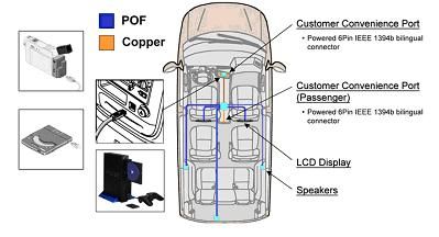 如圖所示,車(chē)載網(wǎng)絡(luò)的架構(gòu)可分為內(nèi)嵌式網(wǎng)絡(luò)和用戶(hù)便利端口(CCP)。目前的技術(shù)規(guī)格將內(nèi)嵌式塑料光纖(POF)車(chē)載網(wǎng)絡(luò)定義為與現(xiàn)有的MOST(媒體定向系統(tǒng)傳輸)技術(shù)相似的規(guī)格。但是,前者的架構(gòu)更加穩(wěn)固、能夠提供更高的數(shù)據(jù)傳輸速率,并且更易于實(shí)現(xiàn)。這個(gè)網(wǎng)絡(luò)能夠連接各種電子設(shè)備,例如DVD播放機(jī)、視頻顯示屏、導(dǎo)航系統(tǒng)、收音機(jī)接收設(shè)備、通訊設(shè)備,如無(wú)線電話或應(yīng)急自動(dòng)遠(yuǎn)程通信及信息處理技術(shù)術(shù)語(yǔ),以及其它的多媒體應(yīng)用。