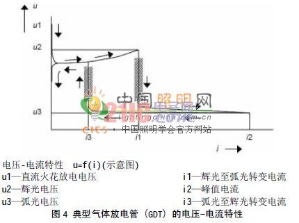 由于浪涌干擾所致,一旦加在氣體放電管兩端的電壓超過火花放電電壓(圖4的u1)時(shí),放電管內(nèi)部氣體被電離,放電管開始放電。放電管端的壓降迅速下降至輝光放電電壓(圖4的u2)(u2在表2中的數(shù)值為140V或180V,與管子本身的特性有關(guān)),管內(nèi)電流開始升高。隨著放電電流的進(jìn)一步增大,放電管便進(jìn)入弧光放電狀態(tài)。在這種狀態(tài)下,管子兩端電壓(弧光電壓)跌得很低(圖4的u3)(u3在表2中數(shù)值為15V或20V,與管子本身的特性有關(guān)),且弧光電壓在相當(dāng)寬的電流變動范圍(從圖4的i1→i2過程中)內(nèi)保持穩(wěn)定。因此,外界的高電壓浪涌干擾,由于氣體放電管的放電作用,被化解成了低電壓和大電流的受保護(hù)情況(u3和i2),且這個(gè)電流(從圖4的i2→i3)經(jīng)由氣體放電管本身流回到干擾源里,免除了干擾對燈具可能帶來的危害。隨著浪涌過電壓的消退,流過氣體放電管的電流降到維持弧光放電狀態(tài)所需的最小值以下(約為10mA~100mA,與管子本身的特性關(guān)),弧光放電便停止,并再次通過輝光放電狀態(tài)后,結(jié)束整個(gè)放電狀態(tài)(熄?。?br />