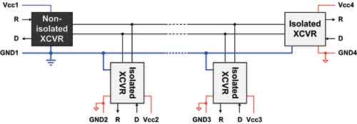 圖8顯示了兩個(gè)遠(yuǎn)程收發(fā)器節(jié)點(diǎn)的詳細(xì)連接,而圖9則顯示了一個(gè)使用了多個(gè)收發(fā)器的隔離式數(shù)據(jù)傳輸系統(tǒng)的例子。除1個(gè)收發(fā)器以外,所有其他的收發(fā)器均通過(guò)隔離連接至總線。左側(cè)的非隔離收發(fā)器為整個(gè)總線提供了單接地參考。