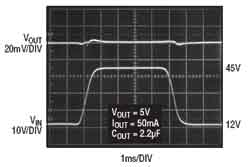 圖3LT3050針對負(fù)載突降情況的瞬態(tài)響應(yīng)(AC耦合)