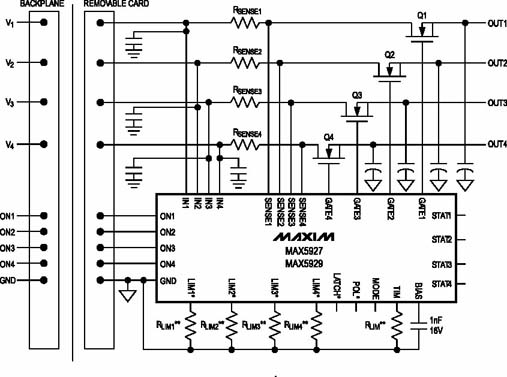 Maxim公司推出了一系列電源熱插拔控制器,適應于各種背板電源的要求。MAX5927/5929是針對低壓電源系統(tǒng)的+1V到13.2V的四通道熱插拔控制器。在電路板熱插拔時,MAX5927/5929控制輸出電壓緩慢升高,同時限制輸入電流小于預設(shè)值,避免瞬態(tài)大電流沖擊,保證了系統(tǒng)的安全性和穩(wěn)定性。圖1是典型應用電路圖,圖2是熱插拔時的啟動電壓、電流波形??梢钥闯?,MOSFET的柵極電壓受MAX5927/5929的控制,按照固定斜率上升,逐漸打開MOSFET,輸出到電路板的電壓也基本同步地按斜率上升,瞬態(tài)電流則始終被控制在門限值以內(nèi),避免了大的沖擊電流的出現(xiàn)。啟動時間和電流限值都可以簡單地通過一個外部電阻來設(shè)定,為設(shè)計工程師提供了極大的靈活性。