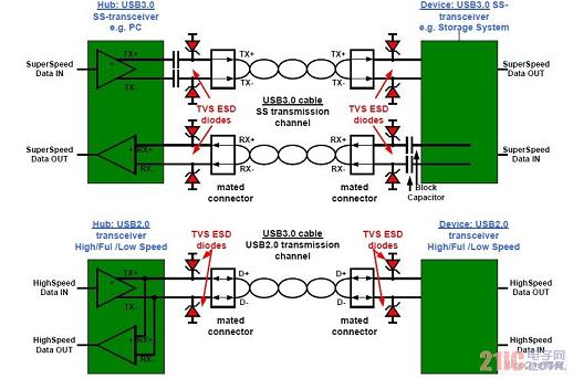 圖1USB3.0物理鏈路在主機(jī)側(cè)和設(shè)備側(cè)帶有ESD防護(hù)。