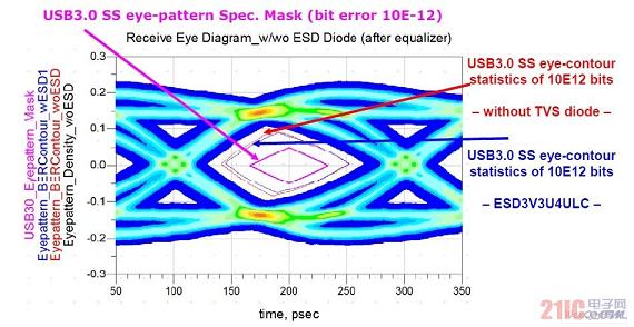 模擬所用誤碼率為1E6。根據(jù)模擬結(jié)果,推導(dǎo)出誤碼率為1E12時的眼圖張開程度(紅色和藍(lán)色輪廓線)。分別在未帶TVS二極管(紅色輪廓線)和帶有TVS二極管(ESD3V3U4ULC,藍(lán)色輪廓線)的情況下,計算出眼圖的張開程度(圖7)。在主機(jī)側(cè)和設(shè)備側(cè)帶和未帶ESD3V3U4ULC時的眼圖圖7:在主機(jī)側(cè)和設(shè)備側(cè)帶和未帶ESD3V3U4ULC時的眼圖。在主機(jī)側(cè)和設(shè)備側(cè)帶有超低電容TVS二極管ESD3V3U4ULC,眼圖張開程度(輪廓線)會受到一定影響。雖然眼圖張開程度會略微減小,但相比于USB3.0技術(shù)規(guī)范中規(guī)定的基準(zhǔn)模式(紅紫色輪廓線),仍大出許多。