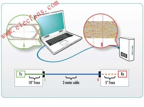 為滿足兼容性要求,USB3.0信號必須可以通過3米長的線纜,并保持信號眼圖開口有足夠的寬度。但這只是部分的路徑,因為在兼容性測試中測量的是接收器經(jīng)過均衡化處理過后的信號。舉例來說,在一般的筆記本電腦架構中,USB控制芯片到連接器的距離大約是10英寸,因此信號實際上可能另外經(jīng)過大約半米的路徑和數(shù)個連接器。