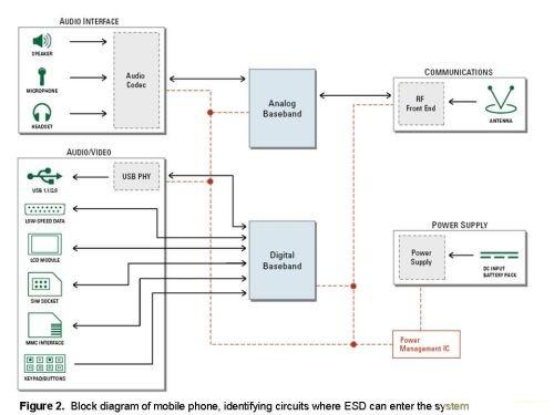 由于手機(jī)的設(shè)計對象是大眾消費(fèi)者,而且可在任何環(huán)境中使用,因此ESD很有可能會進(jìn)入其中的一個端口或I/O接口,并導(dǎo)致芯片組出現(xiàn)電氣不穩(wěn)定現(xiàn)象或完全損壞。圖2用于幫助說明不同電路該用什么樣的ESD保護(hù)技術(shù)。它表明,所有的電路都有可能為ESD進(jìn)入手機(jī)提供一個途徑。