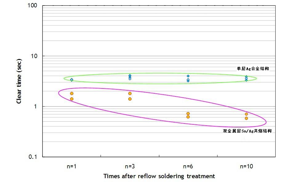 單層Ag合金結(jié)構(gòu)的保險絲即使經(jīng)過多次高溫?zé)崽幚恚钥梢跃S持較穩(wěn)定的熔斷時間。但是雙層Sn/Ag共熔結(jié)構(gòu)的保險絲,其熔斷時間有明顯變快的趨勢。