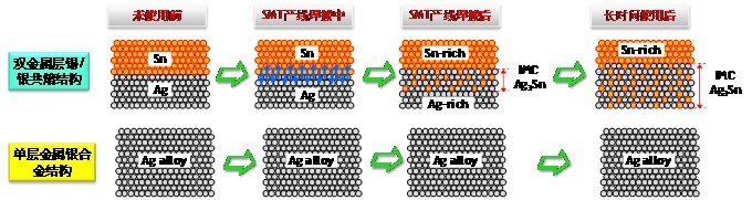 圖7 單金屬層Ag合金結(jié)構(gòu)與雙金屬層Sn/Ag共熔結(jié)構(gòu),在SMT焊接前后及長時間使用后的材料與結(jié)構(gòu)變化示意圖。