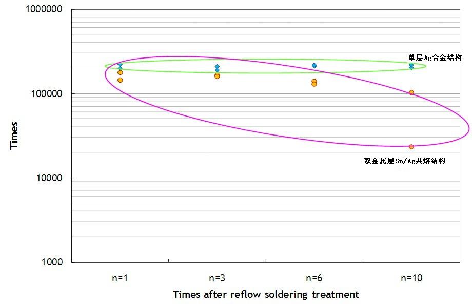 單層Ag合金結(jié)構(gòu)的保險絲即使經(jīng)過多次高溫?zé)崽幚?,仍可以維持一定的耐脈沖能力,承受脈沖次數(shù)都可達(dá)十萬次以上。但是雙層Sn/Ag共熔結(jié)構(gòu)的保險絲,其承受脈沖能力有明顯下降的趨勢,在經(jīng)過10次回流焊錫爐熱處理后,承受脈沖次數(shù)就會下降到十萬次以下。