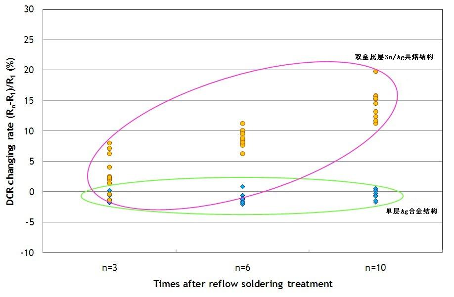單層Ag合金結(jié)構(gòu)的保險絲即使經(jīng)過多次高溫?zé)崽幚?,其冷阻抗變化很小。但是雙層Sn/Ag共熔結(jié)構(gòu)的保險絲,其冷阻抗有明顯變高的趨勢(約升高10~20%),且變異也較大。