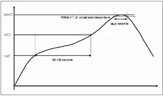 2.回流焊錫爐內(nèi)溫度條件(圖2),最高溫245±5?C/20±5秒,作業(yè)時間240±10秒。