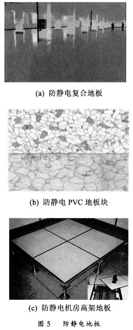 (4)防靜電地板:防靜電地板也有多種,按時(shí)效性分,有永久性和臨時(shí)性;按材料分有導(dǎo)電橡膠、PVC、導(dǎo)電陶瓷等;按鋪設(shè)方式分,有地面直接鋪設(shè)的和架空的活動地板。可根據(jù)實(shí)際需要和成本決定。如需要在地面走多種電纜、管道的環(huán)境如計(jì)算機(jī)房選擇架空鋪設(shè)的活動地板比較好。圖5是一些防靜電地板。