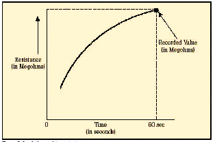 [page]在短時測試中,兆歐表被直接跨接在被測設備上,施加大約60秒的測試電壓。為了在大約一分鐘的時間內(nèi)使絕緣值讀數(shù)達到穩(wěn)定,應該只對低容性的設備進行該項測試?;镜倪B接步驟和驗證測試時相同,所施加的電壓按DC測試電壓公式進行計算。當測試好的設備時,您會注意到,隨電容容量和吸收電流的降低,絕緣阻抗值會穩(wěn)定上升。由于溫度和濕度會影響測試結(jié)果,應該在標準溫度(大約20?C/68?F)下、露點之上的環(huán)境下進行測試。 當設備的額定值等于或小于1000伏特時,絕緣讀數(shù)應該為1MΩ或更高。當設備額定值高于1000伏特時,理想的阻抗應該為每1000伏特上升1MΩ。所測量的絕緣阻抗值通常會略低于以前記錄的值,其下降的趨勢規(guī)律如圖6所示。絕緣值下降的斜率是絕緣材料老化程度的正常信號。陡峭的下降斜率是絕緣失效或可能出現(xiàn)故障的先兆。