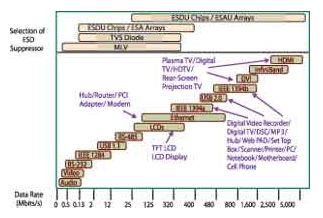 對于數(shù)據(jù)速率在350Mb/s或低于350Mb/s的應(yīng)用,瞬態(tài)抑制二極管和多層壓敏電阻是提供保護(hù)的極好選擇。這些應(yīng)用包括標(biāo)清LCD顯示器、TFT顯示器,以及大多數(shù)的計算機周邊接口及連接。這些信號天生就允許高的插入損耗、高鉗位電壓和觸發(fā)電壓。鑒于電源引腳上并沒有任何信號,因此,高速抑制相應(yīng)并不是必需的。瞬態(tài)抑制二極管和多層壓敏電阻也可以有效地保護(hù)像USB 2.0以及其他更高速率的接口電源引腳。但是,對于像DVI、HDMI、USB 3.0以及最新的IEEE 1394 A和B標(biāo)準(zhǔn)下的數(shù)據(jù)通信線路,實現(xiàn)最小信號失真的高速抑制響應(yīng)對于系統(tǒng)性能和電路保護(hù)是至關(guān)重要的。這些應(yīng)用包括數(shù)字視頻設(shè)備、MP3播放器、手機、 PDA、網(wǎng)絡(luò)交換器、有線和衛(wèi)星電視機頂盒、打印機、掃描儀、復(fù)印機以及筆記本電腦和上網(wǎng)本等計算機設(shè)備。