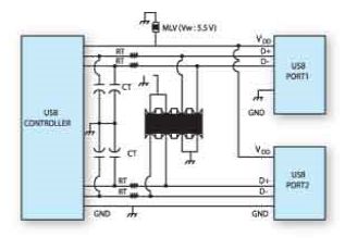 許多高速數(shù)據(jù)應(yīng)用和終端產(chǎn)品采用混合式保護(hù)方式,在數(shù)據(jù)和時鐘線上采用基于間隙的器件,在電源連接部分采用多層壓敏電阻或基于硅的瞬態(tài)電壓抑制二極管。例如,USB接口的D+和D–線要求高速保護(hù),這可以采用分立的芯片利用附加的多層壓敏電阻或瞬態(tài)電壓抑制器件用于VDD電源保護(hù)。PC、筆記本電腦、上網(wǎng)本等產(chǎn)品中常常需要多個USB接口連接。
