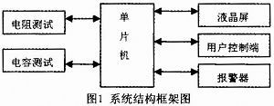 本文設(shè)計(jì)的電阻電容測(cè)試儀的系統(tǒng)結(jié)構(gòu)框架如圖1所示,系統(tǒng)主要由用戶(hù)控制端、單片機(jī)、液晶屏、電阻測(cè)試模塊、電容測(cè)試模塊、報(bào)警器以及其它附加功能模塊等組成。當(dāng)用戶(hù)需要測(cè)量某一電阻或電容的值時(shí),只需要把此電阻或電容放在相應(yīng)的測(cè)試位置,選擇好量程,測(cè)試儀即可自動(dòng)測(cè)出其電阻值或電容值,并把測(cè)試結(jié)果顯示在液晶屏上,方便用戶(hù)讀取。另外,此測(cè)試儀還具有超出量程警示功能和記憶功能,可存儲(chǔ)最近十次的測(cè)量結(jié)果。