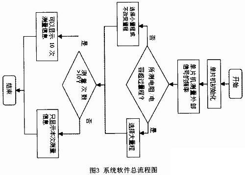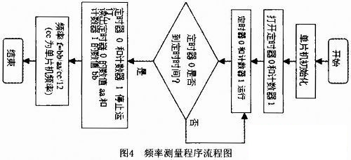 主要的子程序包括頻率測(cè)量子程序、鍵盤(pán)掃描子程序和數(shù)據(jù)存取子程序。頻率測(cè)量程序是系統(tǒng)軟件的核心,原理是用一個(gè)標(biāo)準(zhǔn)的頻率時(shí)鐘去計(jì)算被測(cè)的頻率,頻率測(cè)量程序流程圖如圖4所示。