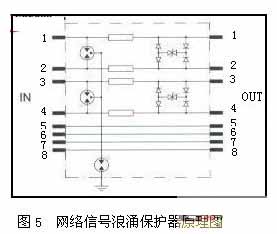 BAx系列信號浪涌保護器是專為通過雙絞線進行信號傳輸?shù)脑O備而設計,以保護其避免遭受感應過電壓和操作過電壓的損害。該浪涌保護器輸入、輸出采用RJ45公/母于接頭串聯(lián)保護。網(wǎng)絡信號浪涌保護器原理圖見圖5所示。