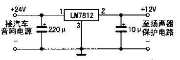 具體制作如下:先把功放輸出端與音箱的引線切斷,按圖2所示電路將引線頭a、b分別接功放的兩組輸出端,c、d分別接左、右聲道音箱:揚聲器保護(hù)電路的電源只能從收放機(jī)中獲取,不可直接從汽車12 v電源中獲取,否則不起開/關(guān)機(jī)保護(hù)作用;若是柴油車所配置的收放機(jī)(使用24 V電源),則要求增加一個降壓電路(見圖3所示),給揚聲器保護(hù)電路供電,以免電源電壓過高損壞IC。