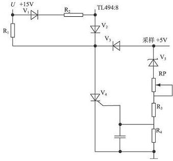 工作原理: 數(shù)控開關(guān)電源由輔助電源+ 15 V 提供給可控硅V4管陽極工作電壓, 實(shí)際輸出取樣電壓送至穩(wěn)壓管V5 , 當(dāng)超出保護(hù)電壓閾值+ 5. 5 V 時(shí), 輸出電壓經(jīng)穩(wěn)壓管、電阻R3 、R4 分壓觸發(fā)可控硅V4 導(dǎo)通, 將輔助電源+ 15 V 通過電阻R1接地, 同時(shí)通過二極管V2切斷8 腳電源。調(diào)節(jié)RP 電位器, 可以對(duì)輸出電壓保護(hù)閾值點(diǎn)進(jìn)行設(shè)置。