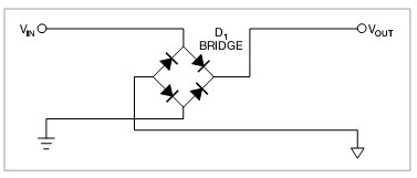 圖2,用一個(gè)橋式整流器,不管輸入是什么極性系統(tǒng)都可以正常工作。此電路二極管功耗是圖1中電路的兩倍。