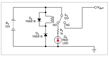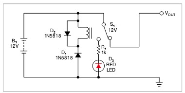 這個(gè)方法是用一只繼電器來處理反極性電壓?jiǎn)栴}。例如,12V供電系統(tǒng)使用12V的繼電器。當(dāng)為電路施加正確極性時(shí),D1為反偏,繼電器S1保持關(guān)閉狀態(tài)。則輸入和輸出電源線正常連接到繼電器的端子,電流就流到最終電路上。二極管D1阻擋了繼電器的供電,防止電路耗電。