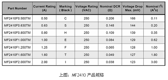 MF2410貼片保險絲提供250Vac(0.5~2A)規(guī)格,最大分斷電流可達100A。產(chǎn)品已通過UL與CQC安規(guī)認證,是目前全球市場上能夠滿足IEC60127-4標準,最小體積的250VAC貼片保險絲。