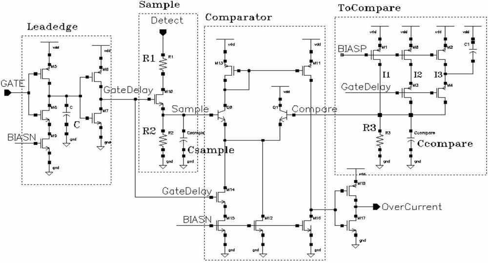 當(dāng)LDMOS 的柵電壓V (GATE) 為高,即LDMOS 管導(dǎo)通時(shí),使圖3 中的采樣開關(guān)管M10(具有較高耐壓和較低導(dǎo)通電阻特性)也導(dǎo)通,同時(shí)開始采集LDMOS 管的飽和漏極電壓;而當(dāng)LDMOS 管的柵電壓V(GATE)為低,即LDMOS 管關(guān)閉時(shí)(非過(guò)流現(xiàn)象),采樣電路則不工作。