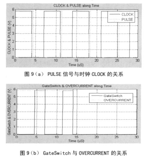 控制邏輯模塊如圖4 所示,該模塊直接控制LDMOS 的開關(guān)。PULSE 信號(hào)的上升沿對(duì)應(yīng)是CLOCK 時(shí)鐘的開始,PULSE 信號(hào)與時(shí)鐘CLOCK 的關(guān)系如圖9 所示。當(dāng)發(fā)生過(guò)流時(shí),OVERCURRENT信號(hào)為低,觸發(fā)器R 端為高,Q 為低,GateSwitch 信號(hào)為低,關(guān)斷LDMOS,從而實(shí)現(xiàn)過(guò)流保護(hù)功能。