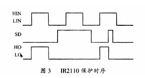 本設(shè)計逆變器為半橋式結(jié)構(gòu),串聯(lián)諧振負(fù)載,驅(qū)動采用IR公司的IR2110半橋驅(qū)動芯片。IR2110電路簡單,成本低,適用于中大功率IGBT,實驗結(jié)果也驗證了IR2110驅(qū)動中大功率IGBT的可行性。IR2110芯片有一個封鎖兩路驅(qū)動的SD輸入端,當(dāng)此引腳為高電平時,立刻封鎖兩路輸出,如圖3所示。