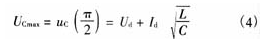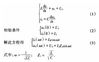 假設(shè)逆變關(guān)斷時濾波電感中的電流全部從電容C中流過,同時整流器繼續(xù)輸出電壓Ud。圖6給出了等效電路,L與C串聯(lián)諧振,由于整流橋電流只能單向流通,所以振蕩到T/4時結(jié)束。