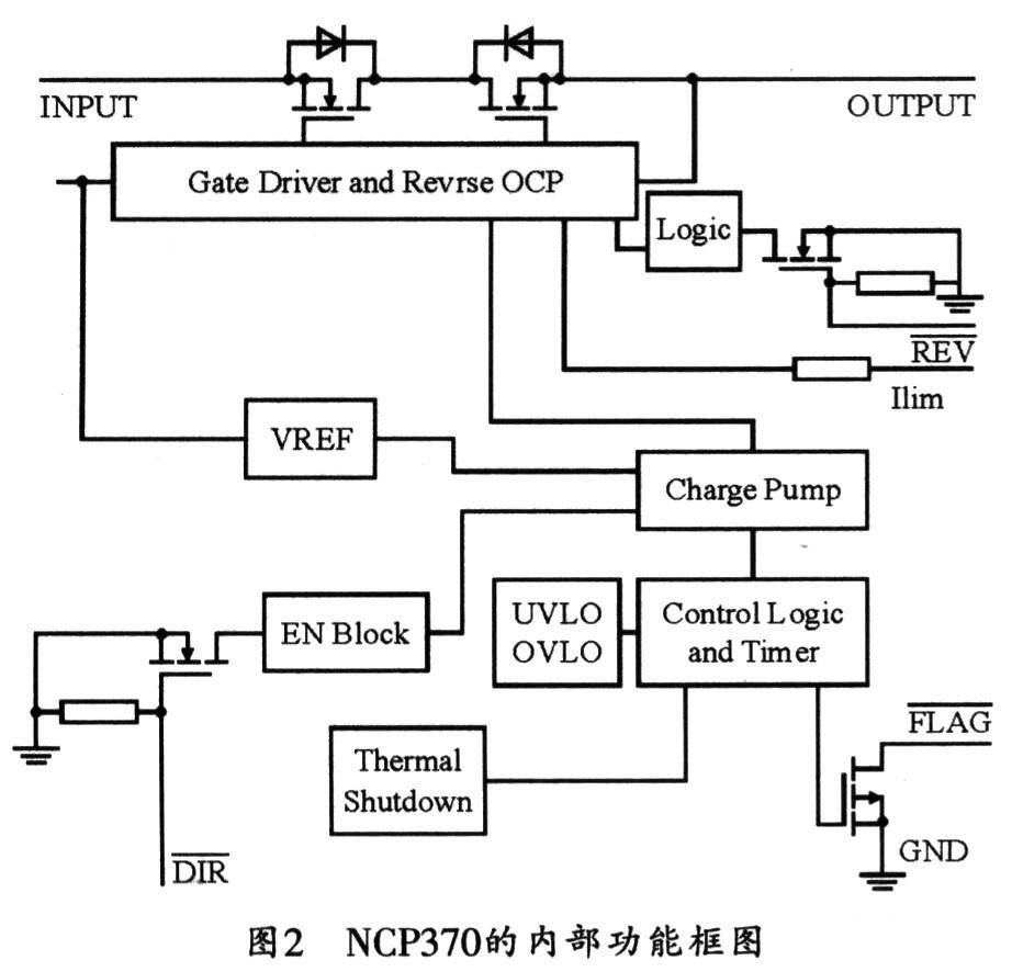 將外設(shè)連到IN端,NCP370便可進(jìn)入反向模式。此時(shí),外設(shè)內(nèi)部的電池可由NCP370的OUT端來供電。在反向模式下,NCP370的REV端必須置低,這樣,當(dāng)外設(shè)發(fā)生過壓、欠壓或過流等故障時(shí),NCP370內(nèi)部的過壓、欠壓或過流保護(hù)電路才會起作用,同時(shí)其FLAG也才會向系統(tǒng)發(fā)出報(bào)警信號。圖2所示是NCP370的內(nèi)部功能框圖。