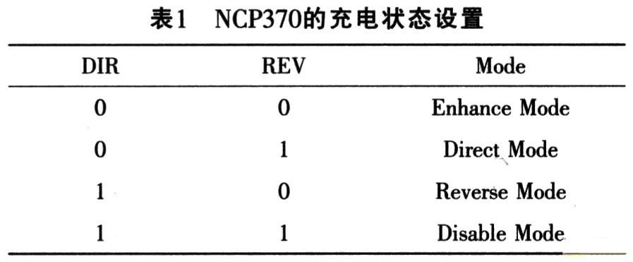將NCP370的DIR端強(qiáng)制拉低,并將DEV端拉高,NCP370即可進(jìn)入正向充電狀態(tài)。而將DIR端置高時(shí),OUT端會與IN端斷開,具體的充電狀態(tài)設(shè)置如表1所列。另外,DIR也會受到OVLO或U-VLO故障的影響(FLAG有效)。