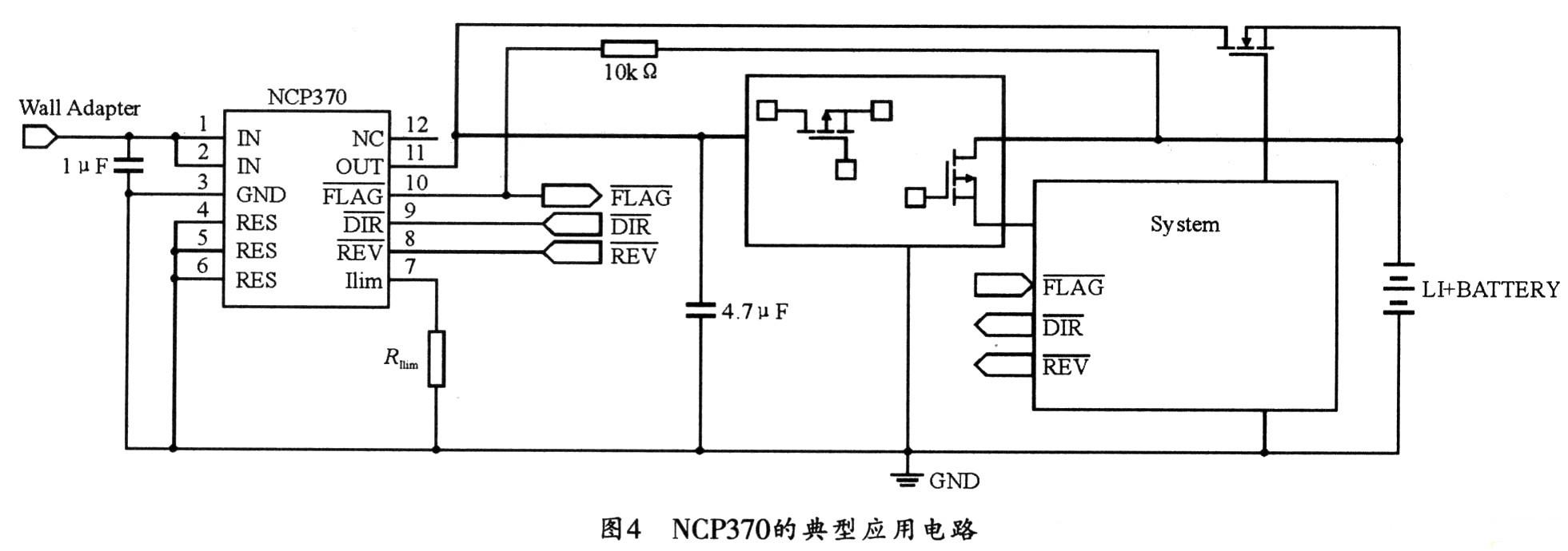 DIR:正向模式輸入端,需與REV結(jié)合起來使用。當(dāng)墻上適配器AC-DC連接到IN端時(shí),NCP370內(nèi)部的N溝道MOS管開啟,電路進(jìn)入正向模式。而當(dāng)該端和REV均為高時(shí),NCP370進(jìn)入關(guān)斷模式,此時(shí),輸出將與輸入斷開。但DIR端的狀態(tài)不會影響到FLAG的故障檢測。