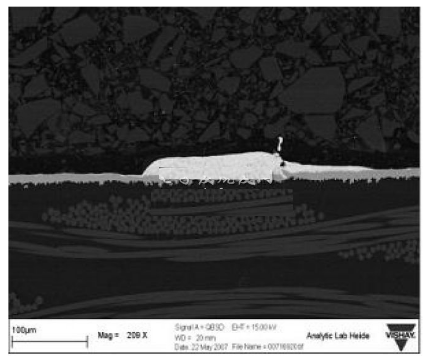 厚膜電阻的使用經(jīng)驗表明,短時過載、焊接熱等熱應(yīng)力和脈沖應(yīng)力會使阻值發(fā)生漂移。這些在貼片式保險絲里發(fā)生的現(xiàn)象將會改變保險絲的特性,進而縮短熔斷時間。雖然熔體使用了幾種不同的材料,例如銅錫合金,可以達到高水平的I2T,但在持續(xù)的熱應(yīng)力之后,熔體對斷開時間的縮短是非常敏感的。這是由于應(yīng)力會導(dǎo)致熔體組成材料的遷移,如圖2所示,該圖顯示了在施加脈沖負載應(yīng)力之后,銅錫合金正在發(fā)生遷移的情況。