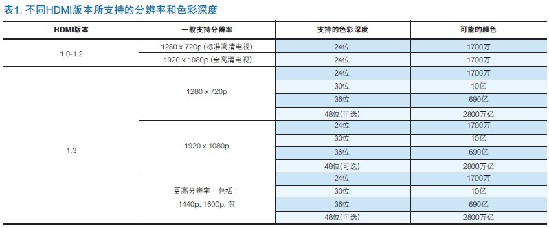 設(shè)計人員通常也註意到HDMI1.3規(guī)范指定的340MHz TMDS時鐘速率比數(shù)據(jù)或信號速率要慢的多。在標準的24位/像素的色彩深度下,通過TMDS對傳輸?shù)臄?shù)據(jù)等同於每像素30比特的編碼數(shù)。因此,三個TMDS通道的每一個通道都必須在一個“系統(tǒng)”時鐘周期內(nèi)傳輸10比特。