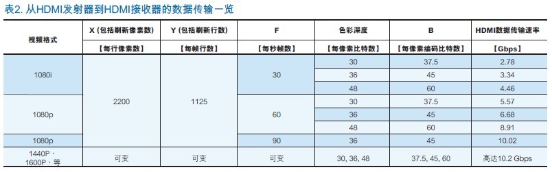 表1顯示了每種分辨率和相應的每行像素和每幀行數(shù)。對於表1列出的每一個色深,都有一個相應的為每個像素顏色而傳輸?shù)木幋a比特數(shù)。需要從HDMI發(fā)射器發(fā)送至HDMI接收器的數(shù)據(jù)量可以被解釋為這些變量之間的關(guān)係,包括更新屏幕所需的幀數(shù)。表2描述了這種關(guān)係: