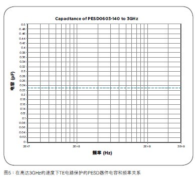 如圖5所示,TE電路保護的PESD器件在3GHz速度下具有穩(wěn)定的電容和頻率關(guān)係。其行為非常類似於一個0.25pF(典型值)的電容,從而可以大大簡化設(shè)計。由於HDMI的TMDS對根據(jù)數(shù)據(jù)模式,視頻源的分辨率和色彩深度改變運行頻率,瞭解ESD保護器件的電容在很寬的頻率范圍內(nèi)是穩(wěn)定的特點可以為設(shè)計人員提供更多的自由度和靈活性。